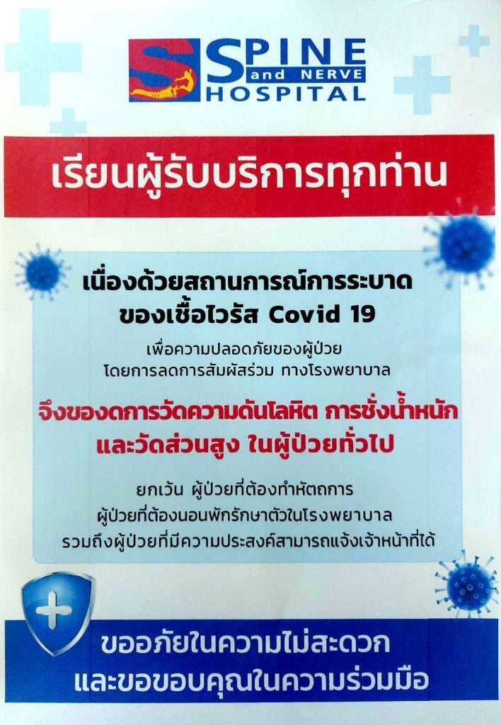 • เนื่องด้วยสถานการณ์การระบาดของเชื้อไวรัส Covid 19 เพื่อความปลอดภัยของผู้ป่วย โดยการลดการสัมผัสร่วม ทางโรงพยาบาลจึงของดการวัดความดันโลหิต การชั่งน้ำหนัก และวัดส่วนสูง ในผู้ป่วยทั่วไป ยกเว้น ผู้ป่วยที่ต้องทำหัตถการ ผู้ป่วยที่ต้องนอนพักรักษาตัวในโรงพยาบาล รวมถึง ผู้ป่วยที่มีความประสงค์สามารถแจ้งเจ้าหน้าที่ได้