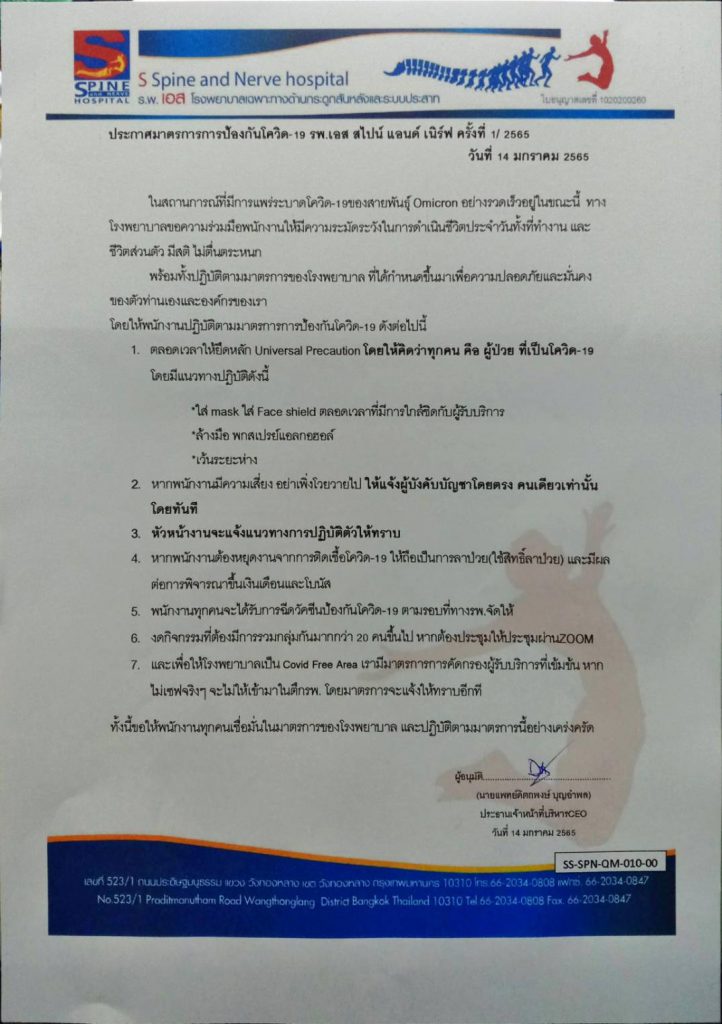 ประกาศมาตรการการป้องกันโควิด-19 รพ.เอส สไปน์ แอนด์ เนิร์ฟ ครั้งที่1/2565