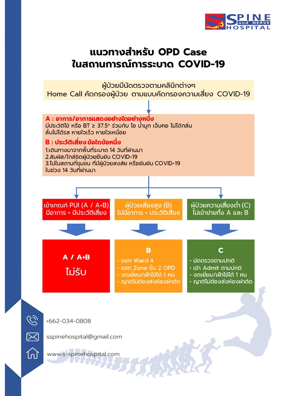 •ปรับวิธีการคัดกรองผู้ป่วยทุกราย ตั้งแต่ call center จนถึง OPD (ตาม Flow แนบ) โดยพื้นที่เสี่ยงยึดตามประกาศกระทรวงเท่าที่จะอัพเดทได้ในช่วงเวลานั้นๆ และอิงตามที่ผู้ป่วยให้ข้อมูล