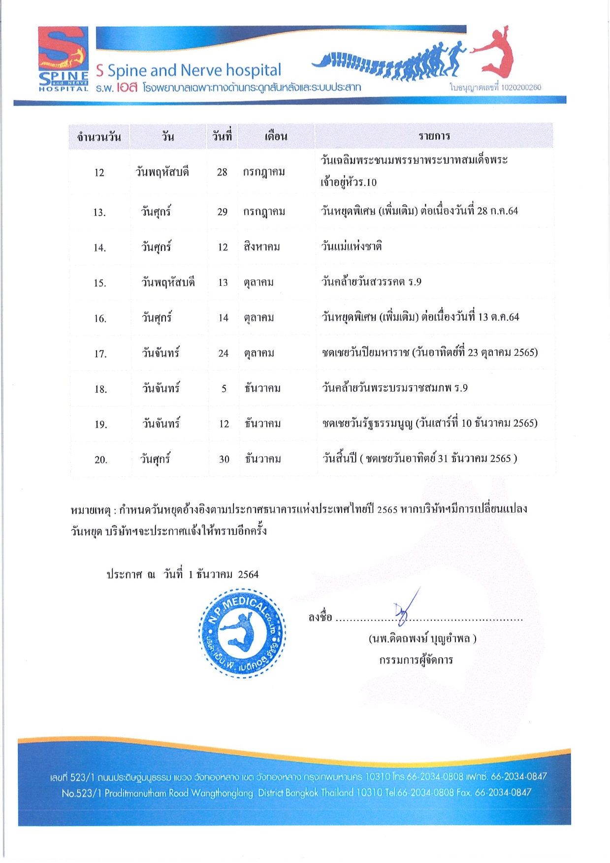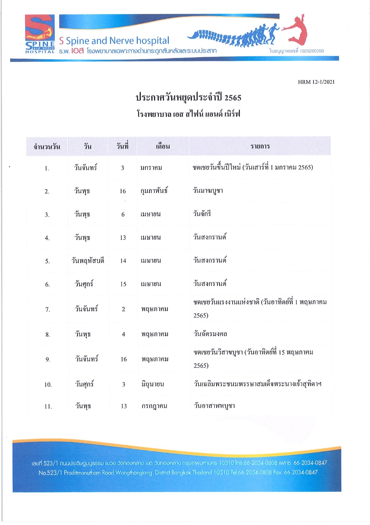 ประกาศวันหยุดประจำปี 2565 (Back Office)