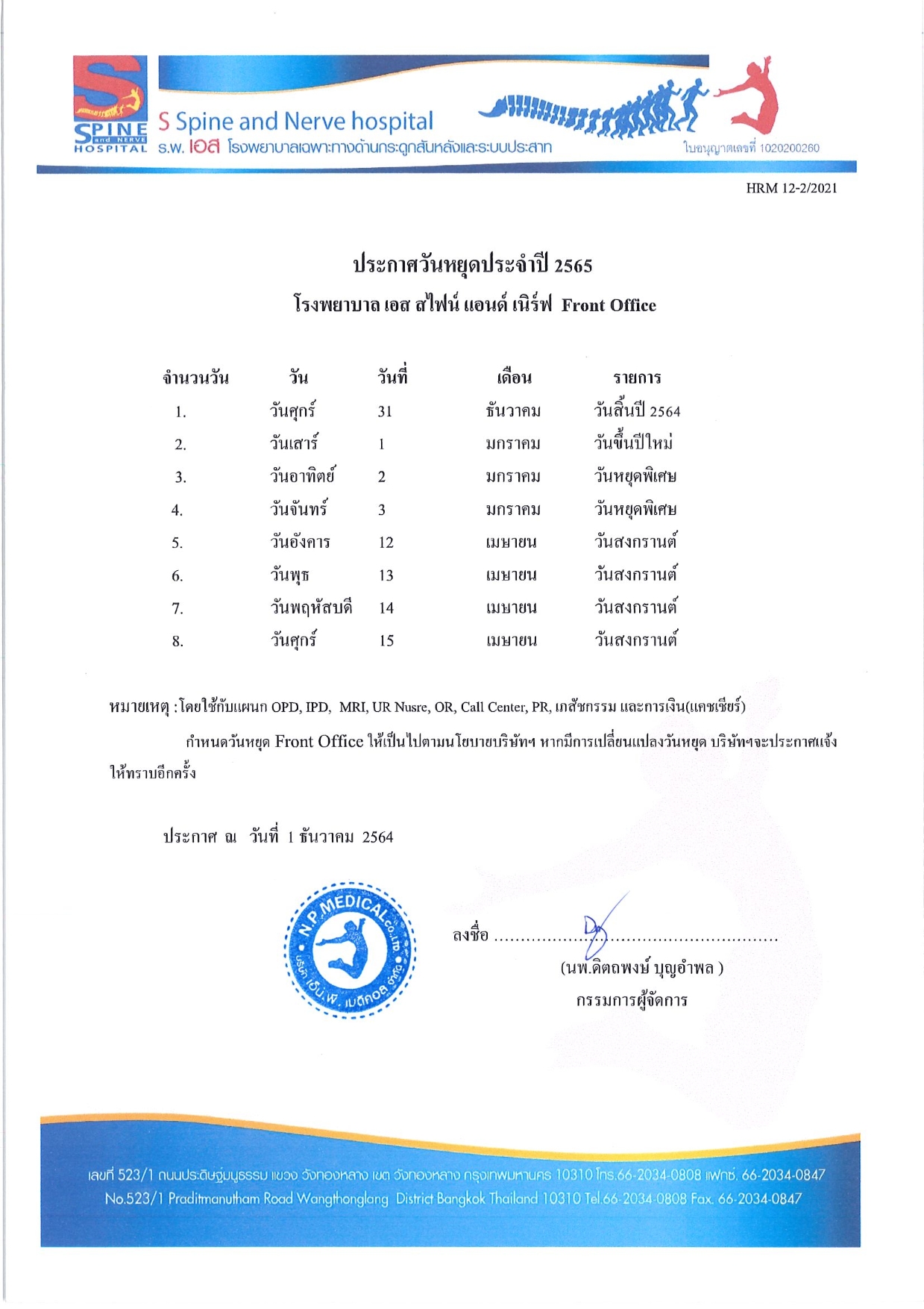 ประกาศวันหยุดประจำปี 2565 (Front Office)