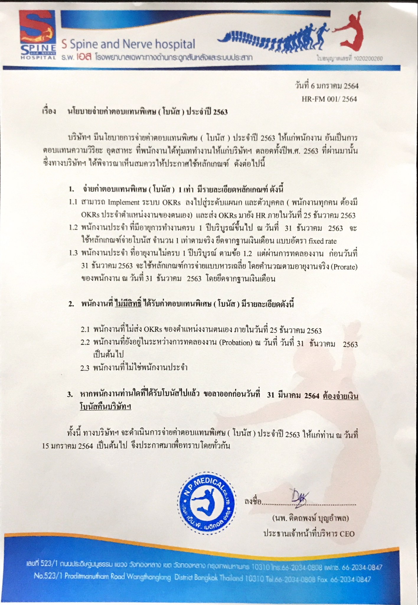 เรื่อง นโยบายจ่ายค่าตอบแทนพิเศษประจำปี 2563